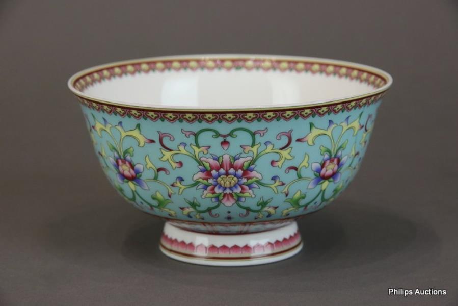 The bowl with rounded sides decorated with lotus and scrolls upon a turquoise ground, with ruyi and lappet borders to the rim and base, the underside bearing a six-character Qianlong mark.