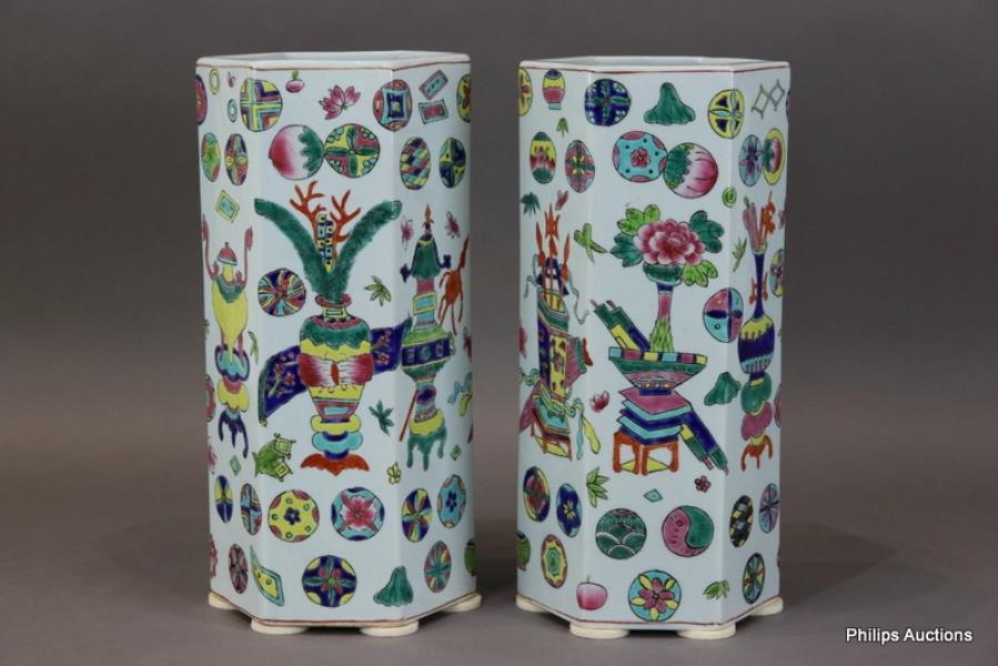 Each hexagonal and decorated in polychrome enamels with auspicious objects, censers, flower vases on stands surrounded by patterned medallions, with printed seal marks to the underside.
