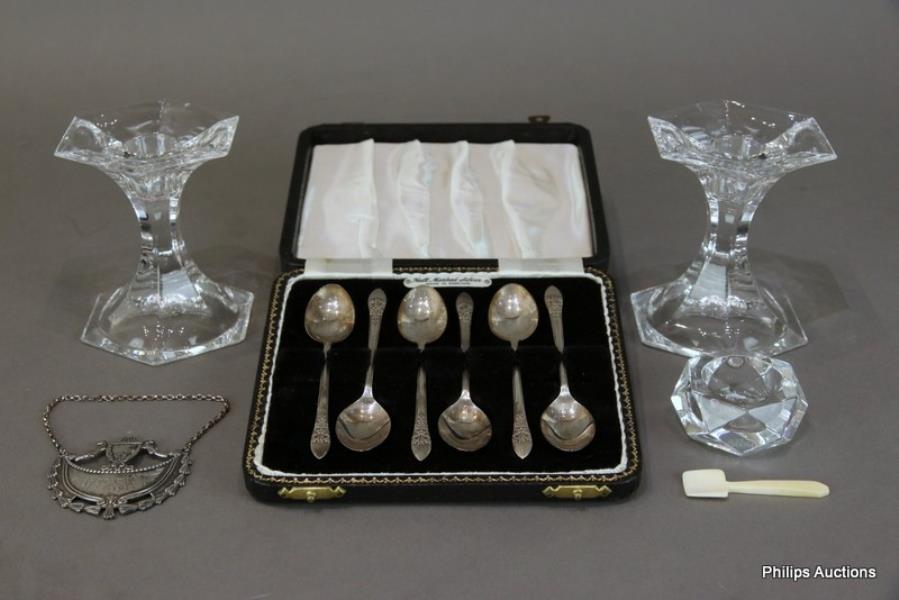 Comprising boxed set 6 George VI sterling silver demitasse coffee spoons (1951 Birmingham, Angora Silver Plate Co Ltd), a sterling silver neoclassical style 'Whisky' decanter label stamped 'Stg Sil' to the reverse, a boxed pair of Royal Doulton crystal candlesticks, and a Baccarat salt with an ivory salt spoon. Silver Weight: 56g Height: 9.5cm (candlestick) Length: 10cm (spoons)