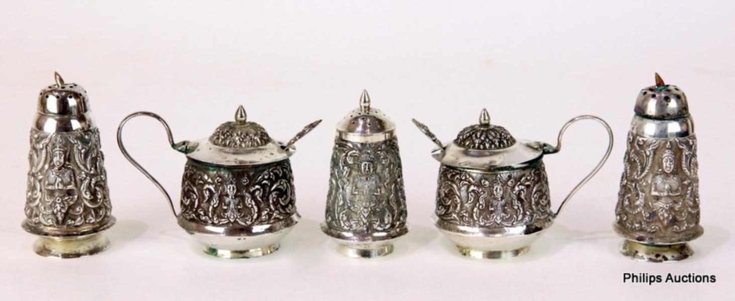 Comprising three salt and pepper shakers of tapering form repoussé decorated with deities, and two similar mustard pots with glass liners and hinged covers (a/f) and two spoons, each stamped 'Thailand Sterling'. Total Weight: 316g