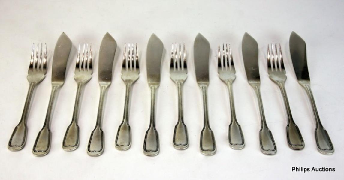 The fine set comprising 6 fish forks and 6 fish knives in Christofle's classic 'Chinon' pattern, each piece stamped under the handle.