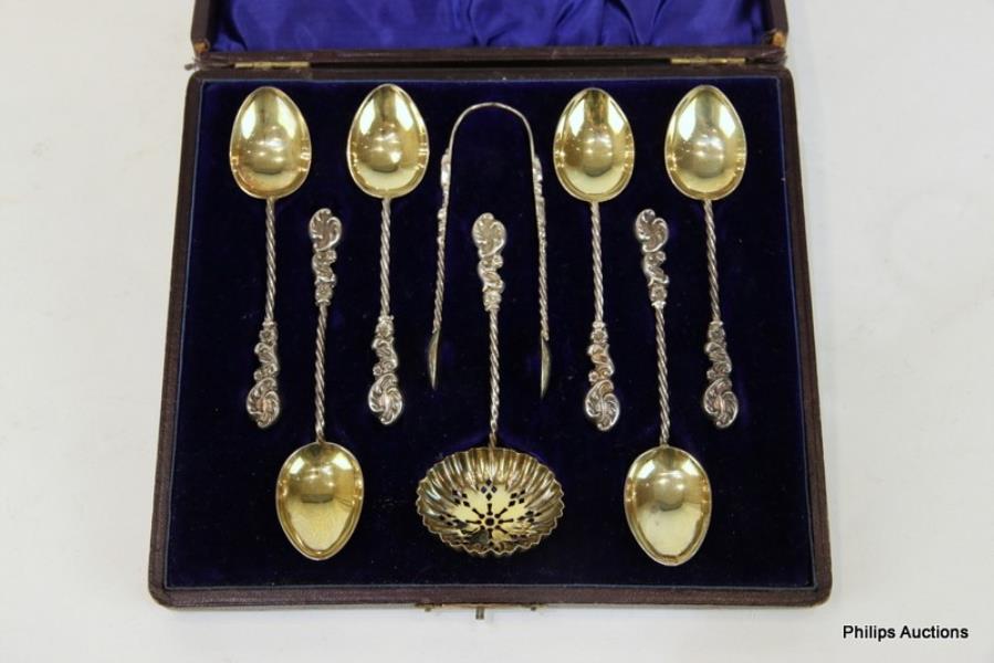 Comprising sugar tongs, sifting spoon and six coffee spoons, each with slender rope twist handles, shapely scrolling terminals and gilt bowls, and marked to the bowls, in their purple velvet lined fitted case. Weight: 60g