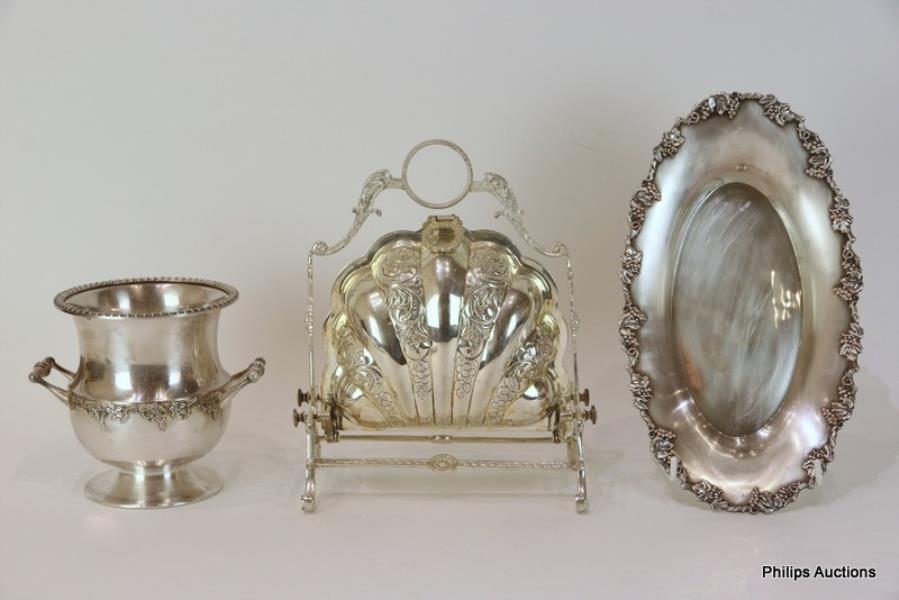 Comprising an Edwardian folding muffin dish, shell shape with pierced folding drainer on a plated stand, an oval serving dish with a cast grapevine border and an Australian silver plated ice bucket with a grapevine border and twin handles.