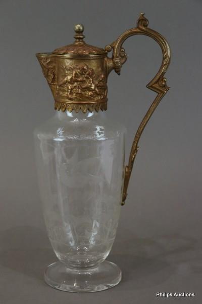 A VICTORIAN METAL-MOUNTED ENGRAVED GLASS CLARET JUG