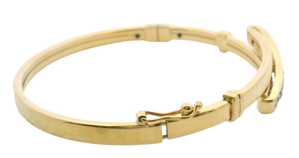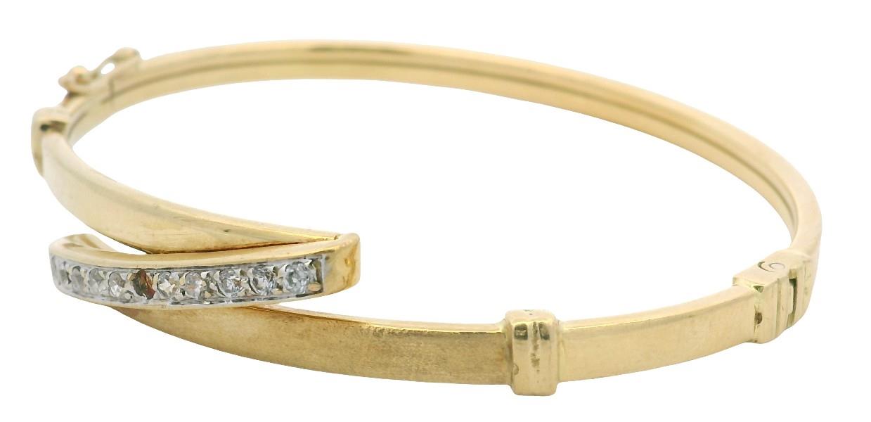 18ct yellow gold, presented as a polished oval bangle of flat exterior and inner surface measuring 3.5mm, with a rounded profile of approximately 2mm, featuring a panel of brush finished gold, parallel to a polished panel, the ends connected by a diagonal panel, lined with round cut CZ's in claws, detailed by grooved stoppers, hinged at the widest point, side latch clasp. Diameter of bangle: 6cm. Total Weight: 11.8g N.B. one stone deficient