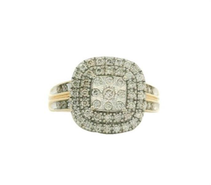 9ct yellow gold with rhodium plating to diamond set section, presented as a double cluster styled dress ring of square cushion shape, centrally featuring nine brilliant cut diamonds illusion set in a raised panel, stepping down to two bead claw set frames of smaller diamonds, completed on double diamond set band tapering to reverse, raised to allow a straight band to sit alongside. A.T.D.W.: 0.80ct.
