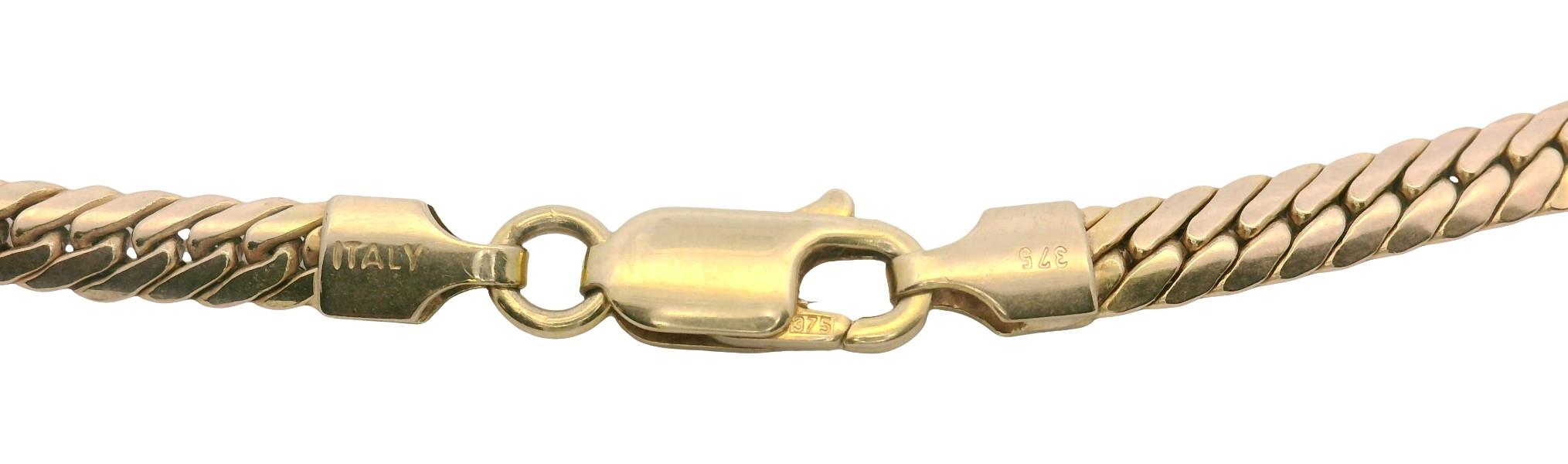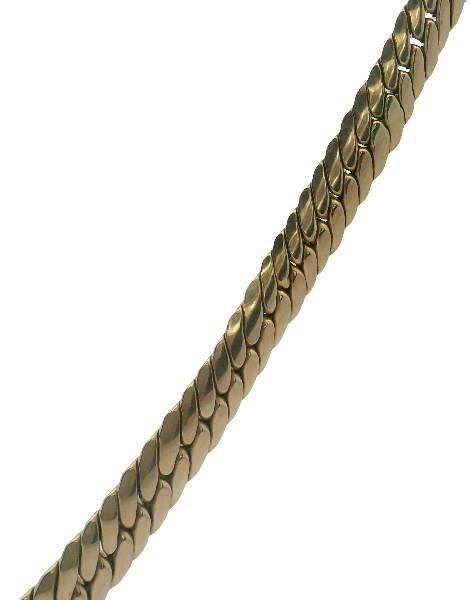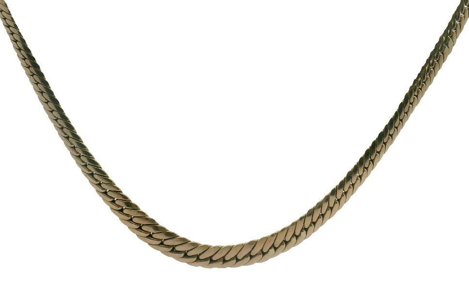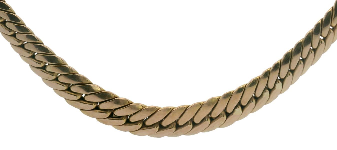 9ct yellow gold, stamped 375, polished, presented as a flat curb like link chain of graduated form, measuring 42cm in total length, polished capped ends and clasp.