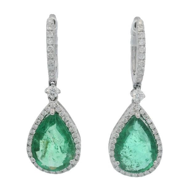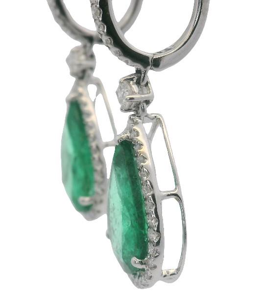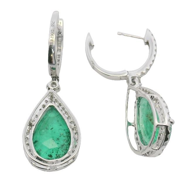 18ct white gold, featuring two pear cut Emeralds, totalling 4.10ct, medium green, three claw set, surrounded by a cluster of round brilliant cut Diamonds, of matched width to the front of horseshoe clasp are further Diamonds, separated by an articulated round brilliant cut Diamond, claw set and claws to mount, pierced post and hinged lever backs. Height of earrings: 3.3cm. Valuation on request. Total Weight: 5.2g