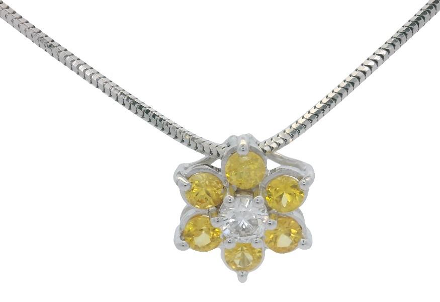 AN 18 WHITE GOLD ROUND CUT 0.77CTS YELLOW SAPPHIRE & 0.20CTS DIAMOND FLORAL PENDANT ON CHAIN, 5.9G
