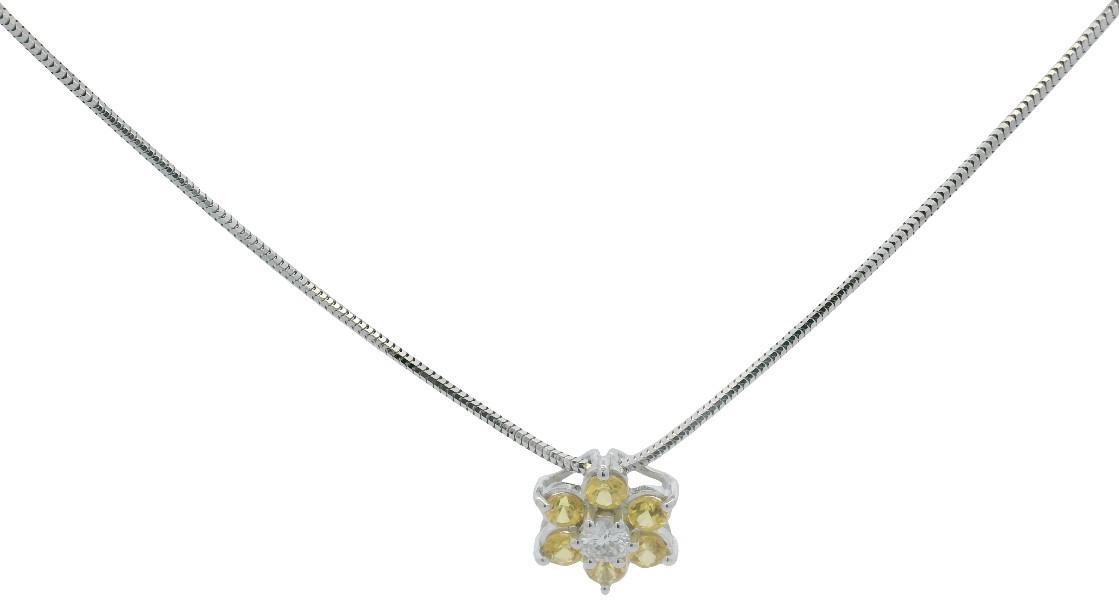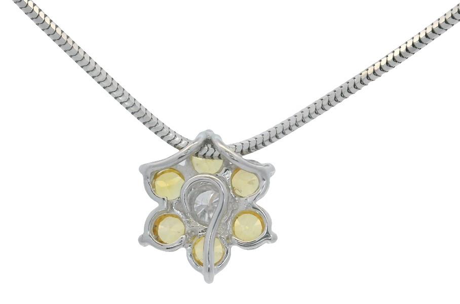 18ct white gold, featuring six round cut Sapphires, totalling 0.77ct, fancy medium yellow colour, outer claw set, extending claws to the side mount, centring a single round brilliant cut Diamond of 0.20ct, in multi claws, concealed bail, suspended on a smooth snake rope chain, measuring 45cm in length. Total weight; 5.9g