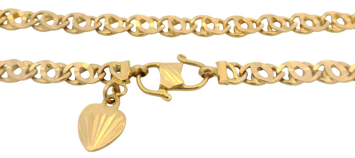 22ct yellow gold, stamped 916 with other marks, presented as a flat link fancy styled bracelet of bright cut pattern, the double oval interlocking links completed with traditional "S" styled clasp, suspending a single peach charm also in 22ct gold. Length: 21cms