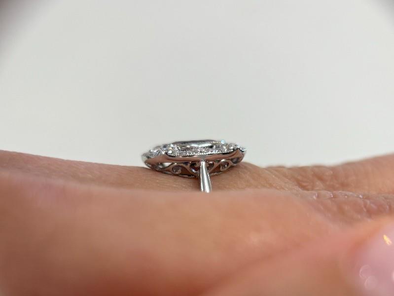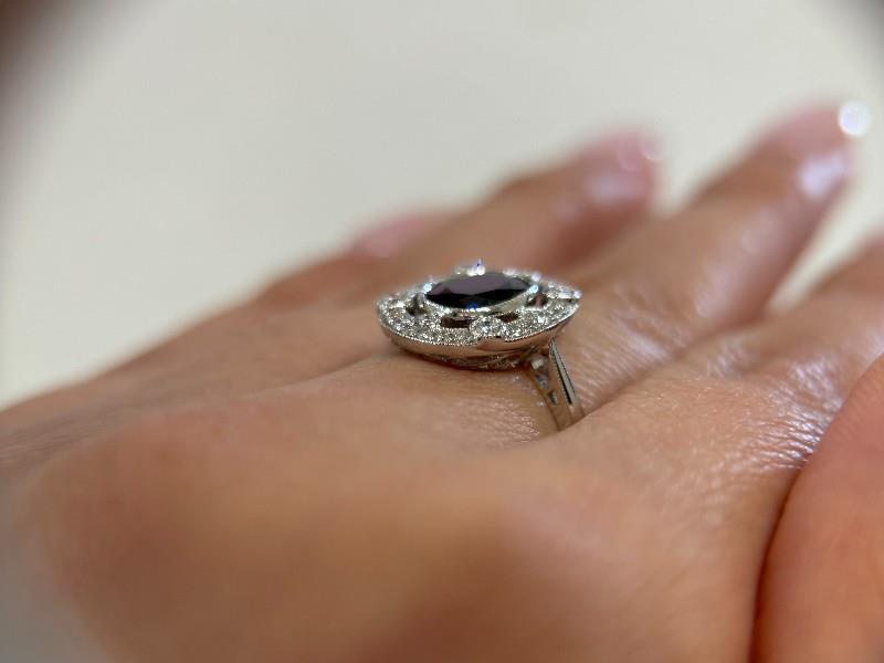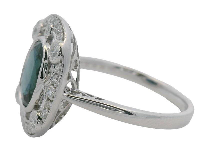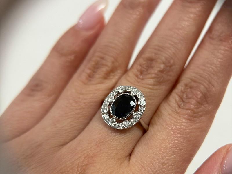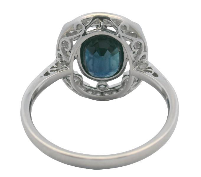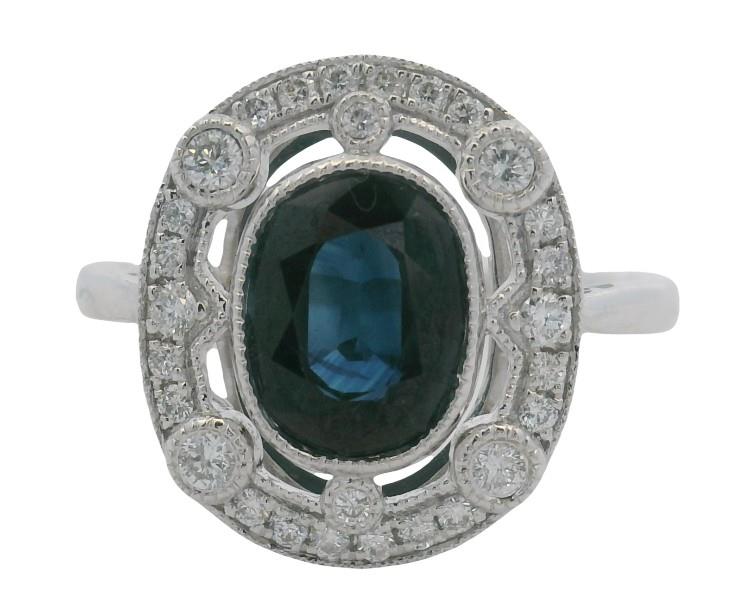 14ct white gold, featuring an oval cut Sapphire of 1.86ct, bezel set, surrounded by a floating halo detailed by larger round brilliant cut Diamonds to the corners in bezel set, multi size round brilliant cut Diamonds to complete, claw sets, decorative scroll underbaskets with matched design to the profile of shoulders, pinched shoulders, merging into a half rounded band. Ring size: M1/2. Valuation on request. Total Weight: 3.0g
