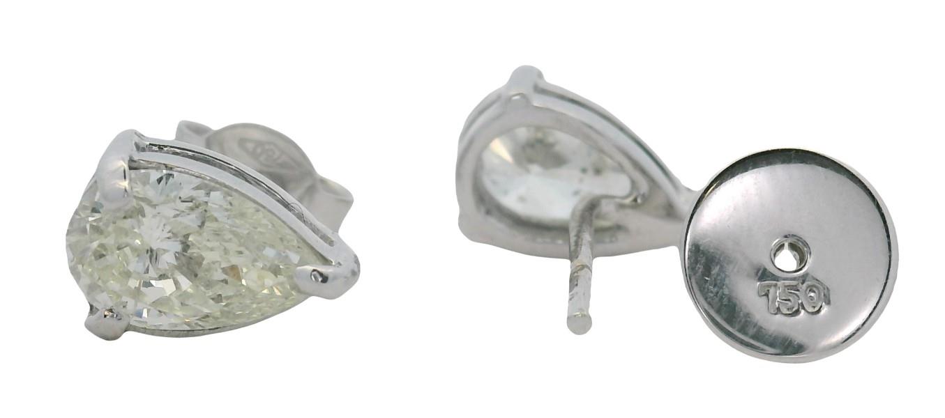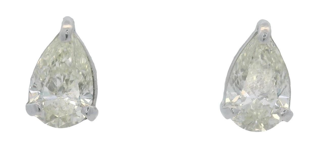 AN 18CT WHITE GOLD PAIR OF SOLITAIRE PEAR CUT DIAMOND STUDS TOTALLING 2.00CTS, T.W. 2.3G