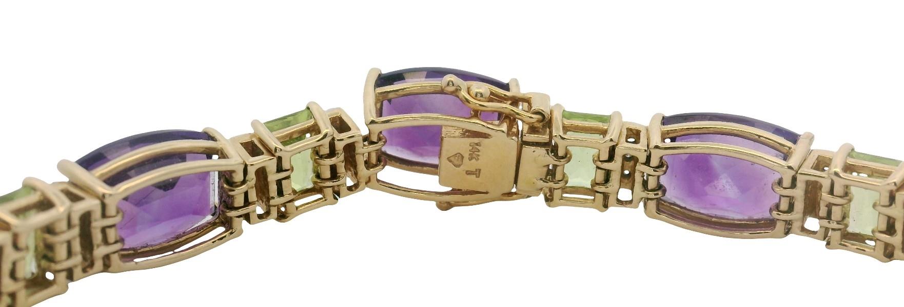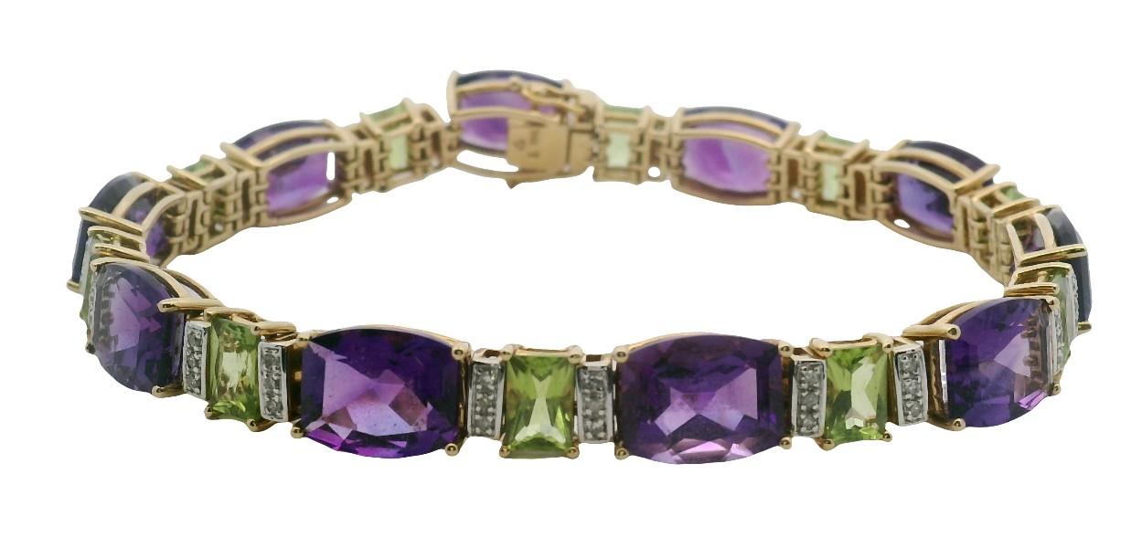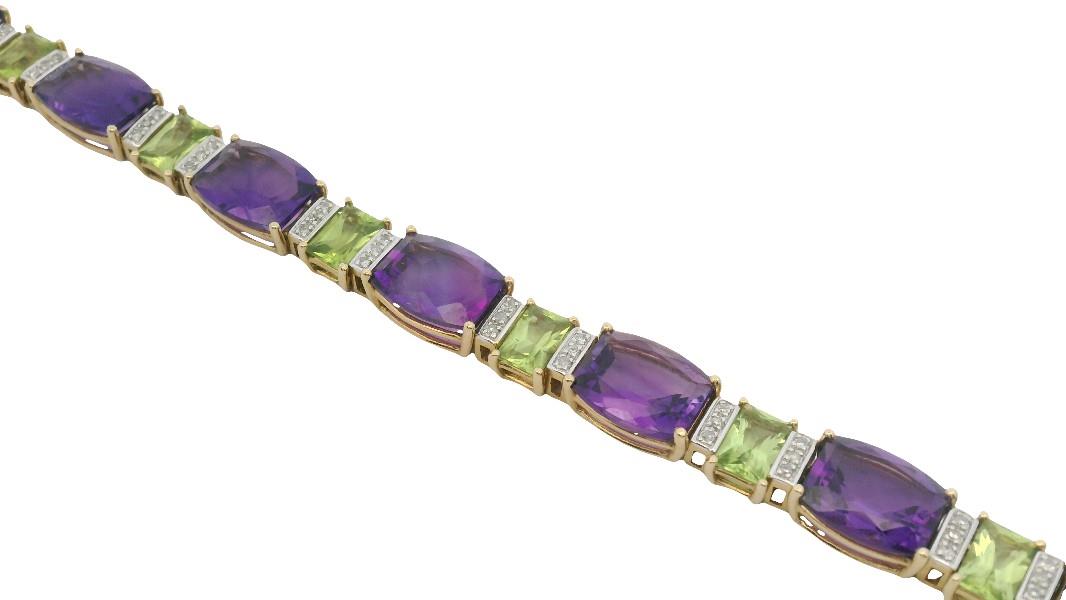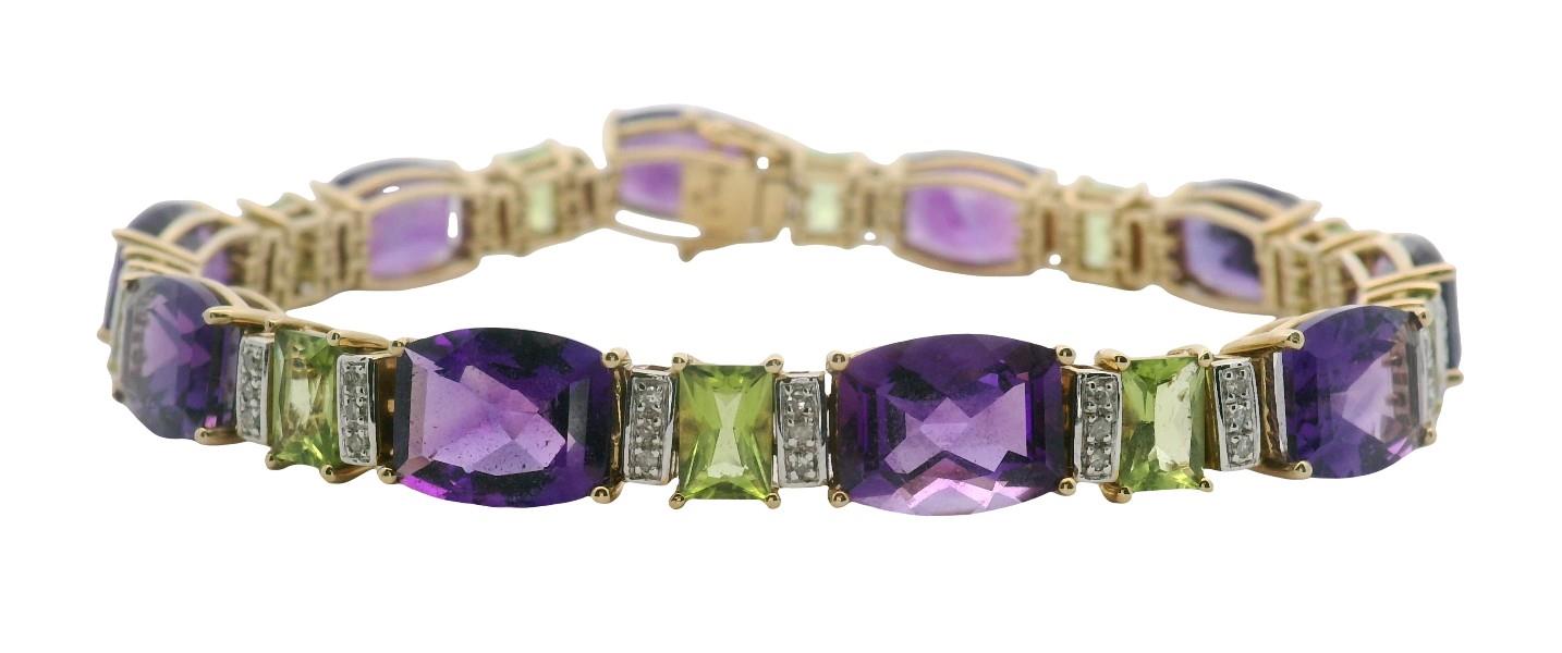 14ct yellow gold, featuring ten side set barrel cut Amethysts of medium purple colour, alternating between ten scissor cut Peridots of medium green colour, flanked by vertical panels of three round cut Diamonds each, totalling 0.30ct, all individually claw set and linked through by double links, measuring 19.5cm in length, semi flexible, complete with concealed boxed clasp, secure by double side latches. Valuation on request. Total Weight: 26.1g