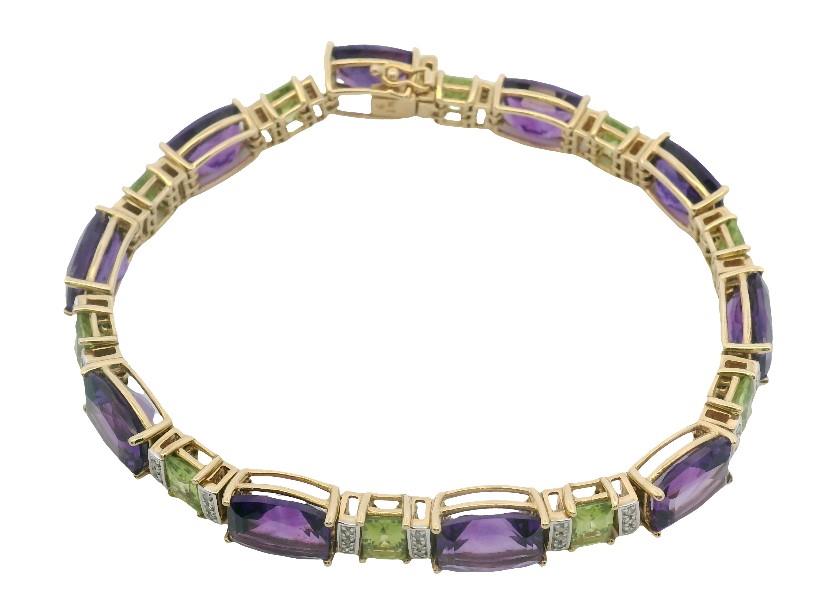 A 14CT YELLOW GOLD AMETHYST, PERIDOT & DIAMOND LINE BRACELET, TOTALLING 0.30CTS, T.W. 26.1GRAMS