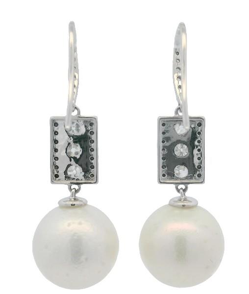 14ct white gold, featuring near round Pearls, white with cream and blush overtones, good lustre, half drilled and articulated from a panel, lined with round brilliant cut black Diamonds, centring round brilliant cut Diamonds, claw set, articulated from shapely Diamond front detailed pierced hooks. A.T.D.W.: 0.91ct. Height of earrings: 4.2cm. Valuation on request. Total Weight: 10.6g