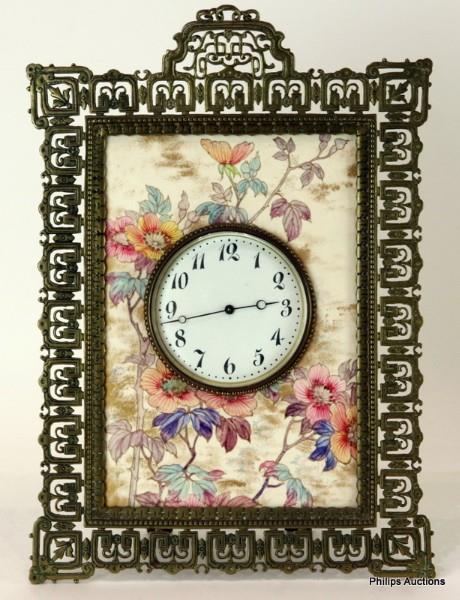The circular enamel dial with black Arabic numerals, within a Royal Doulton ceramic surround painted with Aesthetic movement floral design, within a cast and pierced brass frame with easel back, the drum cased movement with platform escapement. Ex Dalby Antiques $1695