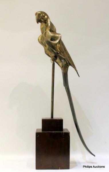 The polished brass figure of a large and long-tailed macaw on a perch, mounted on a stepped pedestal wooden base.