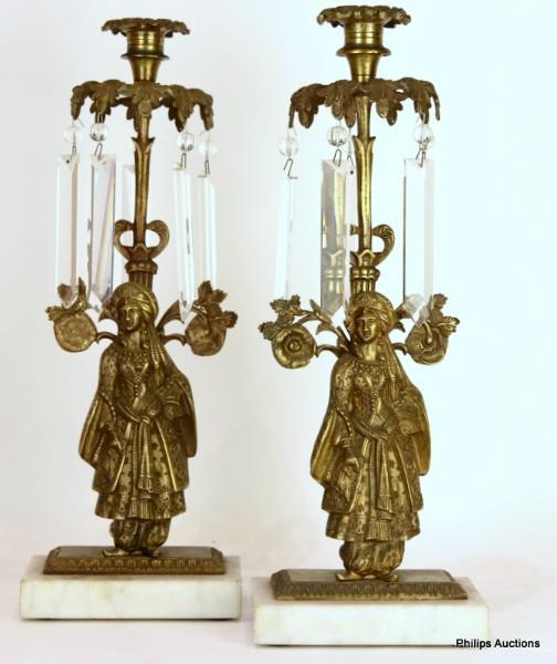 The pair of gilt metal girandole single light candlesticks, each cast with figural stem of a woman standing in traditional dress upon white marble base, with foliate bobèches and suspending cut crystal prisms.