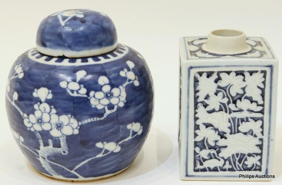 Comprising a square section tea caddy, each side moulded with floral sprays, and with stylised bats to the top, together with a Chinese export ginger jar and cover (a/f) of traditional form, decorated with blossoming prune branches on a mottled blue ground.