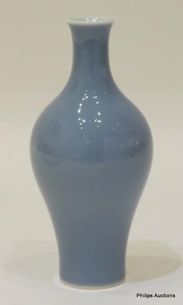 The vase of pear-shaped form with a tall, slender neck and slightly flared mouth, covered in a sky blue 'clair-de-lune' glaze, the underside with Qianlong mark.
