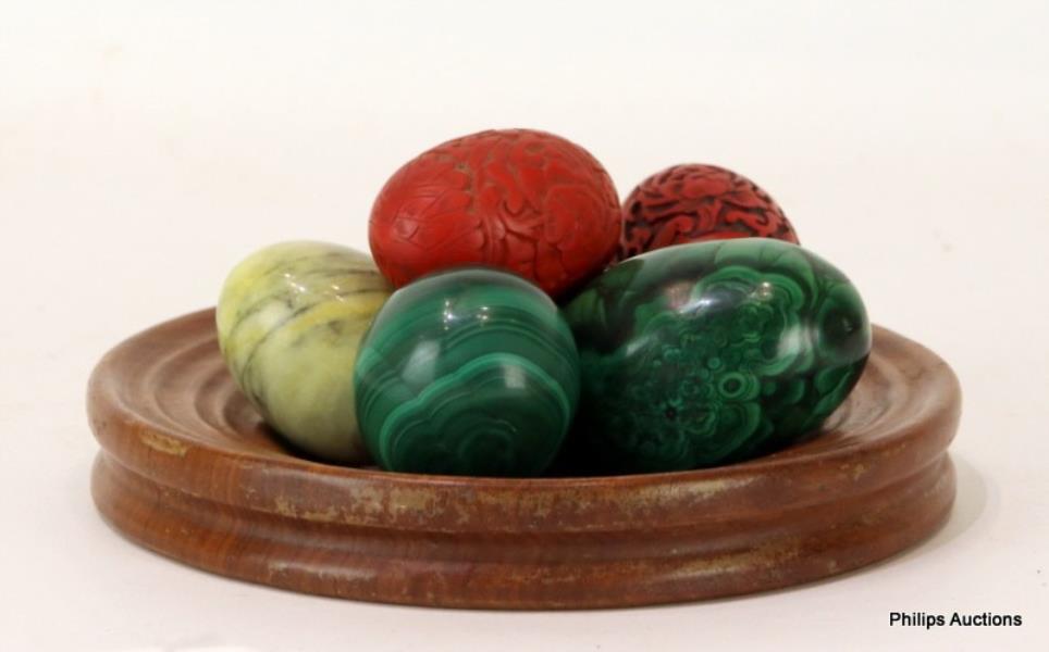 Comprising two malachite eggs, two in polished hardstone and two cinnabar floral eggs, on a turned wooden tray.