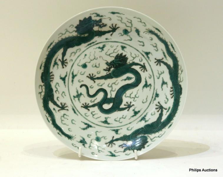 Of circular form, with slightly sloping sides, decorated with central dragon, surrounded by a pair of dragons, in tones of green, on circular foot, six character mark to base, in a fitted case.