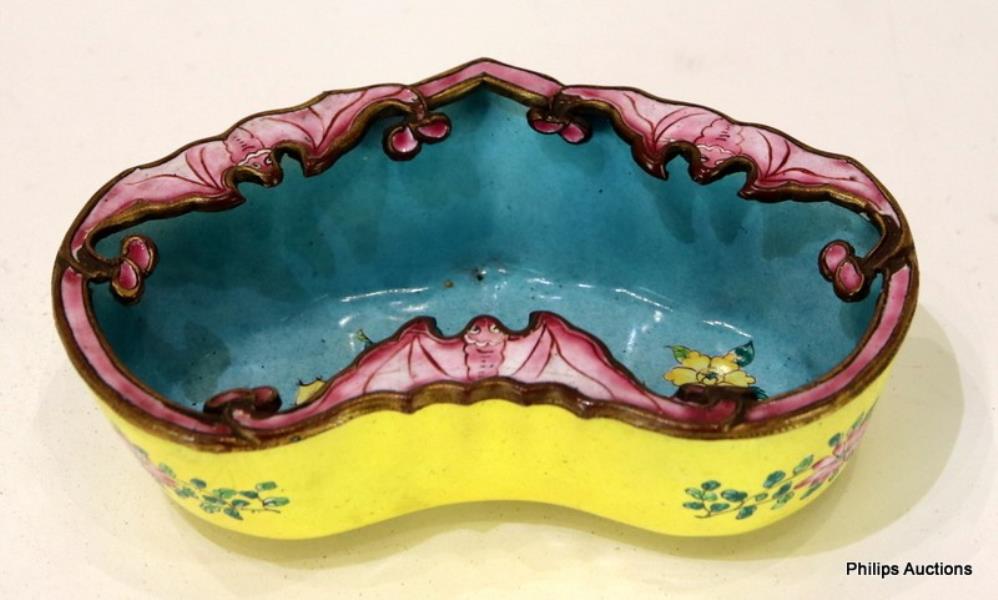 Floral decorated to the interior with blossoming flowers upon rocky outcrop against a turquoise ground, the exterior with floral sprays upon yellow ground, the shaped rim decorated with three bats. Height: 4cm Length: 11cm