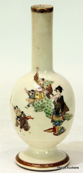 The ovoid bottle vase with a cylindrical neck and conical base, decorated with children playing ohajiki (Japanese marbles) accompanied by adults, upon a plain cream ground, with Kinkozan mark and Shimazu crest to the underside.