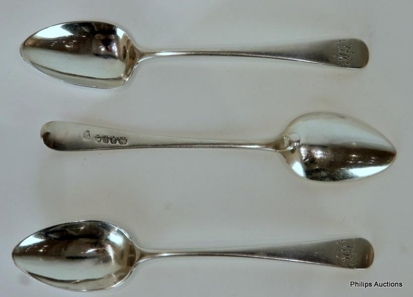 The set of spoons in Old English Pattern, each marked under the handle and engraved with initials to the terminal.