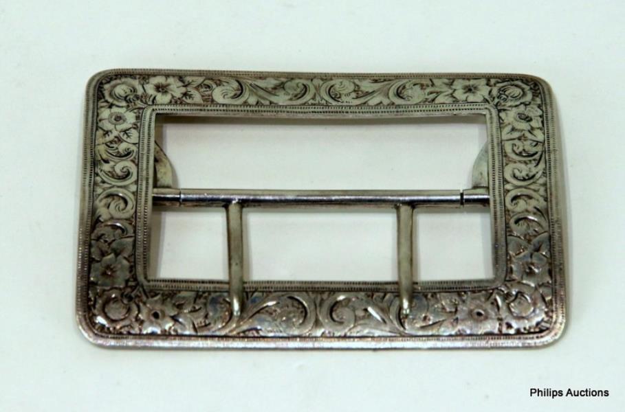 Possibly American 19th century, the sash pin rectangular belt buckle finely engraved with flower heads and scrolls, stamped 'Silver / Sterling' underside.