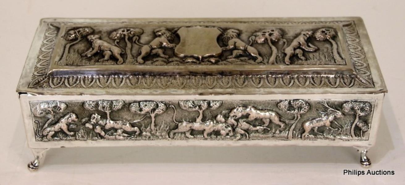 The oblong box with hinged cover raised upon bracket and ball feet, decorated throughout in relief repoussé with hunt scenes featuring lions, deer and leopards against a finely tooled background, the cover with vacant shield-shaped reserve flanked by rampant lions and surrounded by lappet border, unmarked, X-Ray tested .800 silver. Weight: 445g