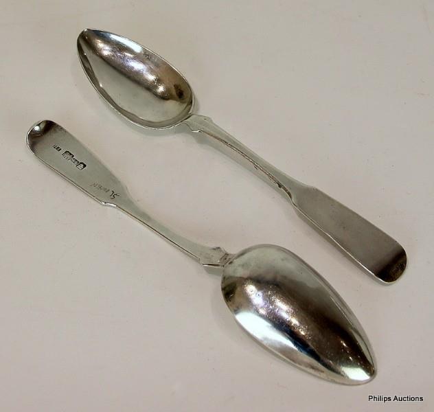 The pair of dinner spoons in fiddle pattern, each with assayer, maker's mark to the underside.