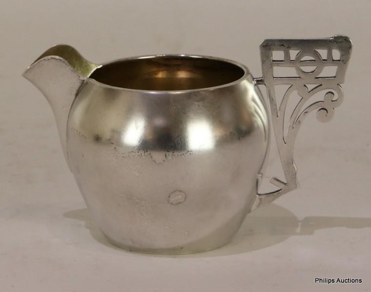 The Russian silver creamer with a matt finish to the body and gilt interior, with a shaped and geometric pierced Art Nouveau handle, marked to the underside and Spout.