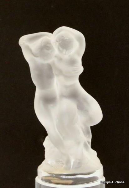 Depicting Pan and Diana in a loving embrace, upon on oval clear base, with original label and engraved 'Lalique France' to the underside.