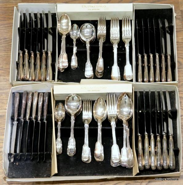 The silver plated flatware part sets in slightly different patterns, each piece stamped underside, in Dunklings fitted cardboard boxes.