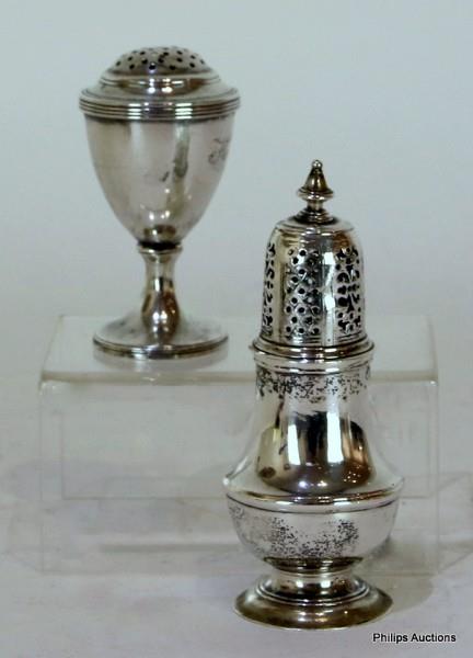 Comprising a probable George II pepperette of baluster form, the cover with pierced panel decoration and knop finial, crested, maker's marks underside rubbed, possibly 1748 London, George Hindmarsh; together with small pepperette stamped with thistle mask, no city mark, maker's mark WP. Weight: 126g Height: 11cm Width: 5cm