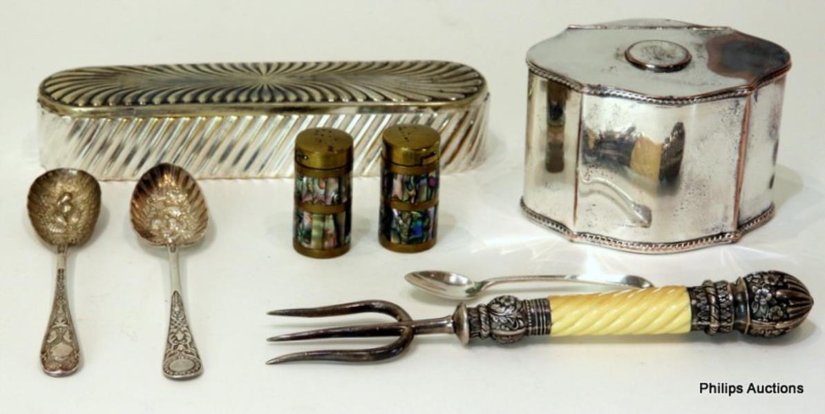 Comprising an early 20th century WMF oblong trinket box with a swirling fluted pattern to the body and detachable cover, stamped underside, a shaped tea caddy with hinged cover, unmarked, two silverplate berry spoons and a coffee spoon, an ivory mounted bread fork and a salt and pepper shakers set inlaid with paua shell.
