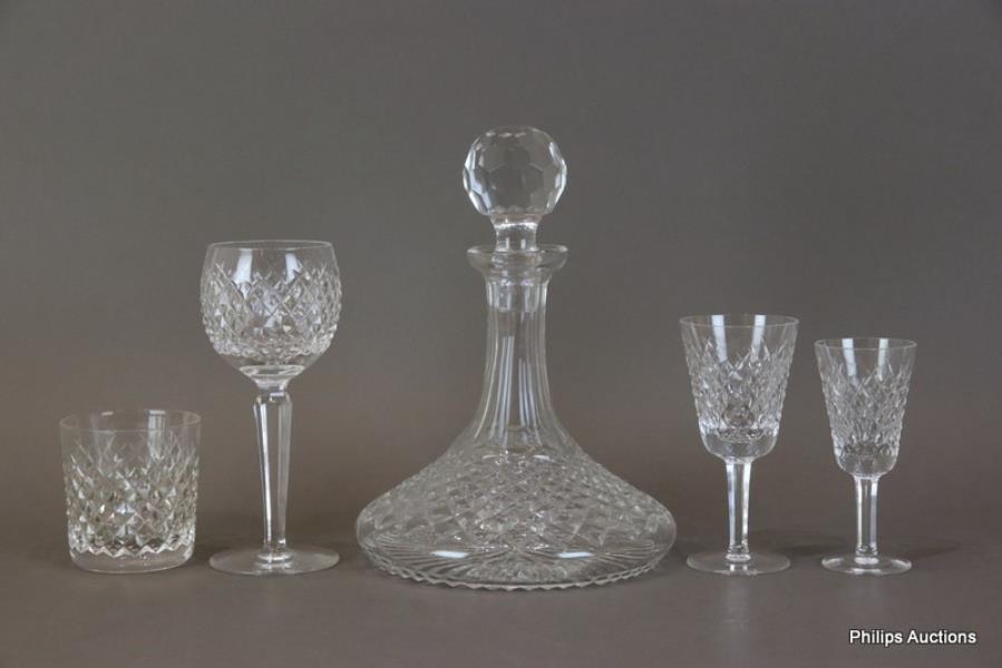 Comprising 6 hock glasses, 6 port, 6 sherry, 2 'old fashioned' tumblers and a ships decanter and stopper, each in classic 'Alana' with cut crosshatch decoration and with Waterford stencil mark to the underside.