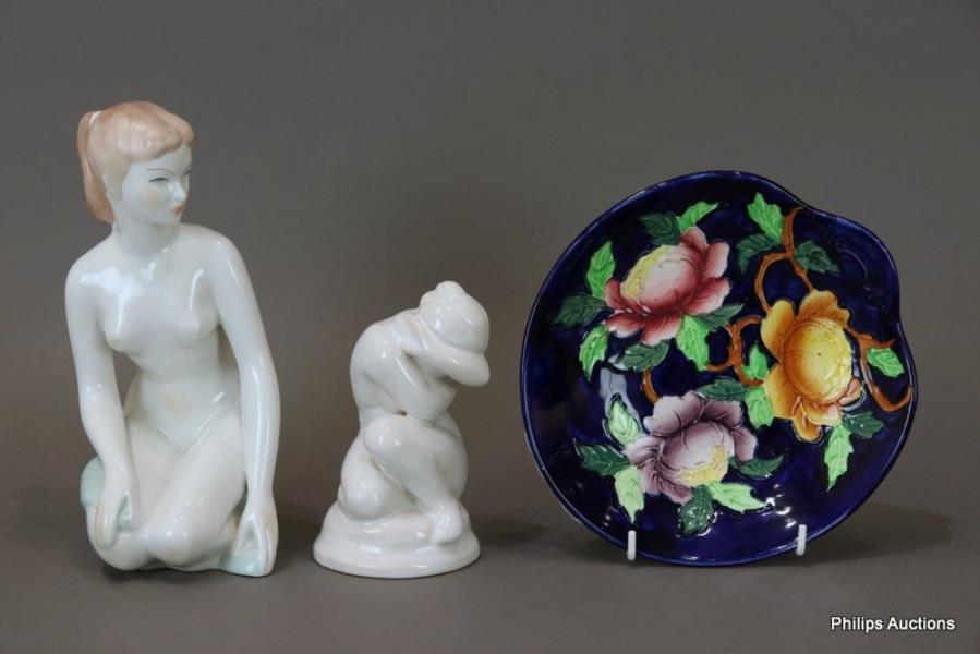 Comprising a Danish ceramic figure of a seated woman by Lauritz Hjorth, signed and numbered 310 underside, a Hungarian art deco style ceramic figure of a young woman kneeling with Aquincum Budapest stamp underside, together with a Maling ware floral serving dish decorated in relief with flower heads and foliage against a cobalt blue ground, stamped underside.
