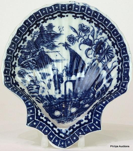 The pickle or sweetmeat shell dish, transfer decorated in 'Fisherman and Cormorant' pattern,