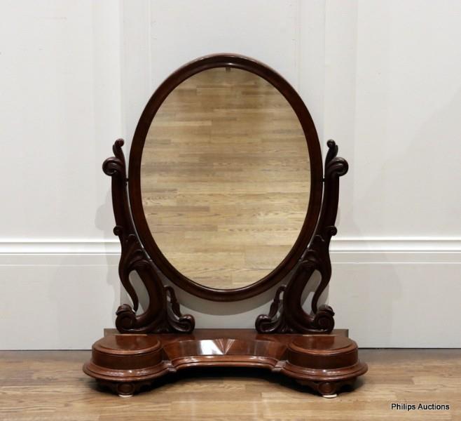 Of typical form with an oval mirror set in a channel grooved frame with curvaceous carved side supports above a shaped base with two small hinged compartments with a flush lid.