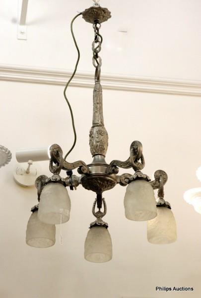 AN ART DECO SILVERED BRONZE FIVE BRANCH CHANDELIER
