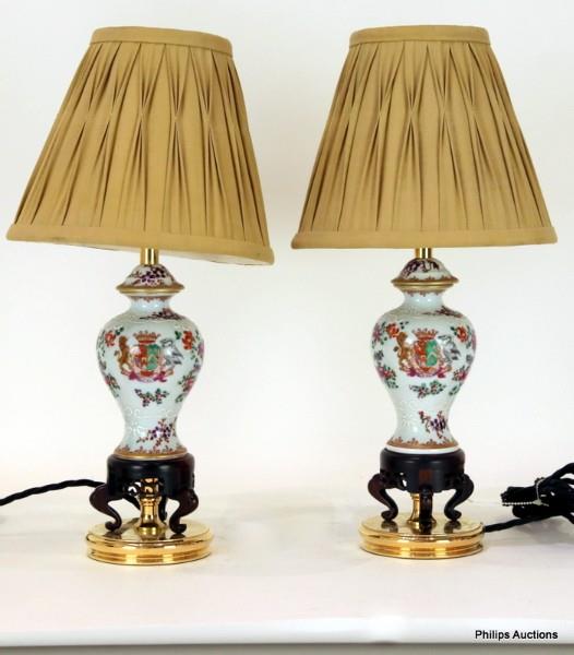 The pair of Samson of Paris baluster jar and cover in Chinese Export style, painted with armorial and polychrome floral sprigs and clusters, mounted as lamps with brass base and Chinese tripod stand, and fitted with beige fabric pleated shades.