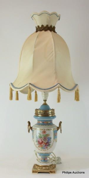 The Italian porcelain covered urn with twin handles and floral bouquets upon a bleu celeste ground in the Sèvres manner, mounted as a table lamp with ornate gilt metal base, and fitted with a cream fabric shade with a pale blue trim and tassels. The lamp socket needs repairing.