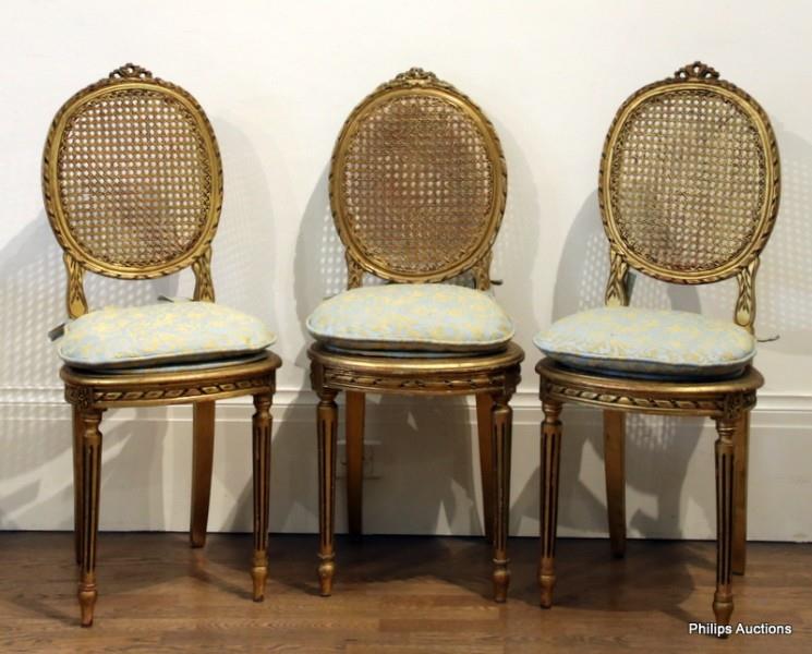 A SET OF THREE LOUIS XVI STYLE GILTWOOD CANED CHAIRS WITH CUSHIONS