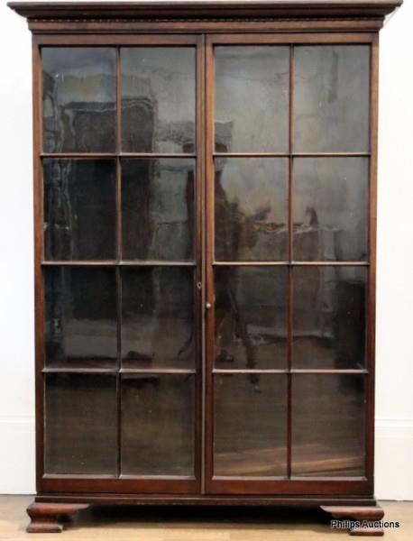 The bookcase or display cabinet with an everted pediment and moulded trim above double glazed sectional doors with original glass panes, opening to internal shelves, upon later bracket feet.