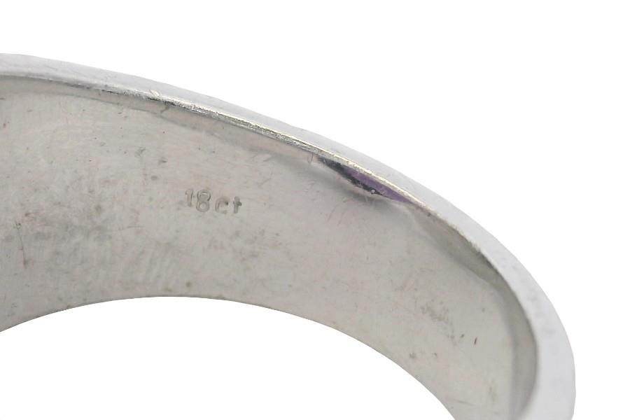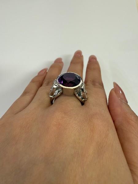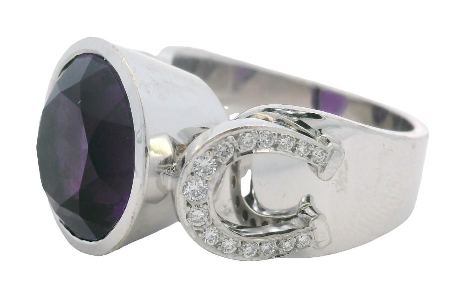 18ct white gold, crafted as a bold solitaire styled dress ring, set with a central round intense purple amethyst of approximately 9.00cts, bezel set in a closed side mount, flanked to each side by horseshoe shaped panels grain set with small diamonds, completed to a wide polished band tapering.