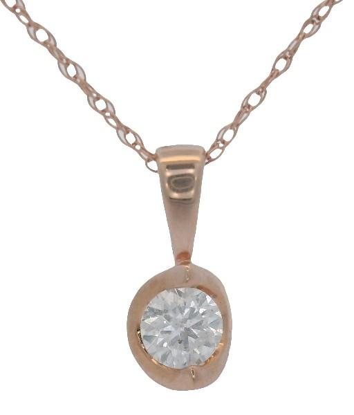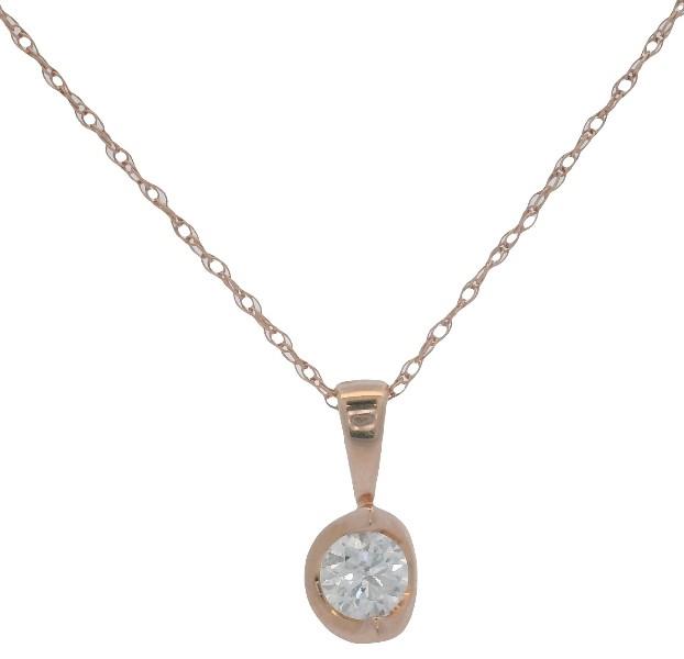 14ct rose gold, featuring a round brilliant cut Diamond of 0.20ct, tension set, against a semi circle mount, fitted with polished tapered bail, presented on a rope link chain measuring 45cm in length, spring ring clasp. Valuation on request. Total weight: 1.0g