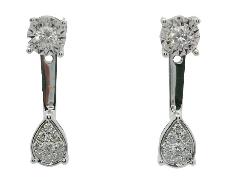 18ct white gold, featuring two illusion set round brilliant cut diamonds, basket set, pierced post, suspending a vertical tapered panel with three pierced openings, attached to a tear shape frame, set with round brilliant cut Diamonds, grain set, butterfly backs. A.T.D.W.: 0.364ct. Approximately total weight: 3.1g